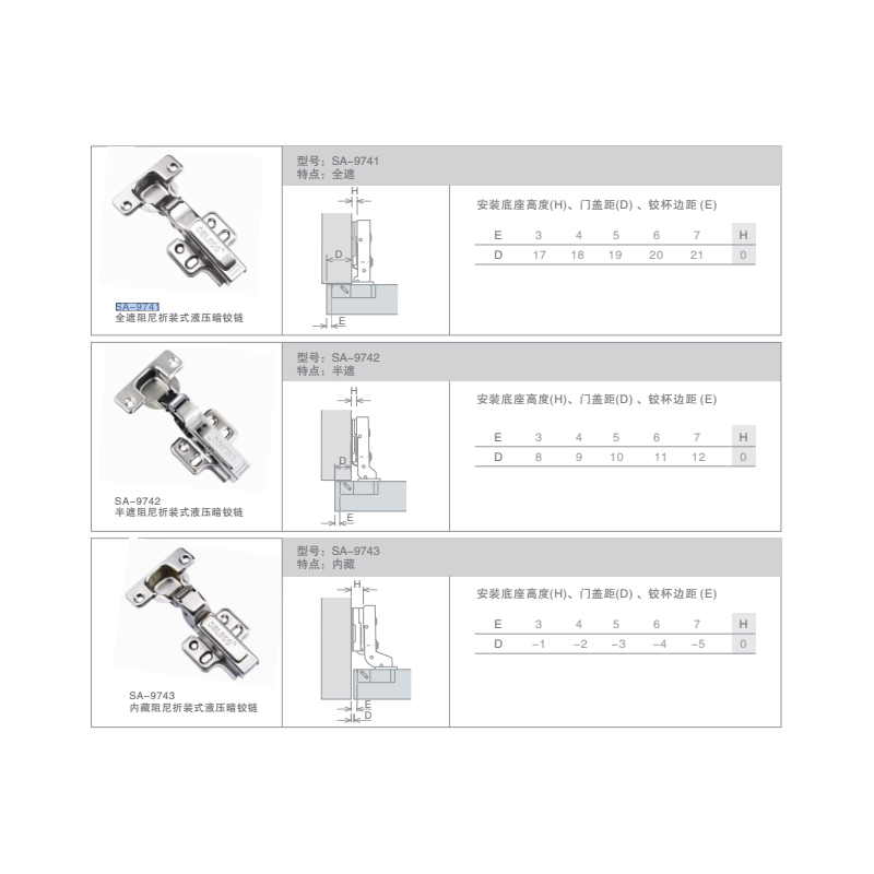 产品名称:拆装阻尼暗铰链 适用范围:适用各类柜门 主要材质:冷轧钢 铰杯深度:11 蘑菇影视在线观看. 5mm 铰杯直径:Φ35mm 面板(E)尺寸:3-7mm 门板厚度:14-21mm 开启角度:105° 最大承重:2只/8KG 主要功能:内置阻尼装置和自闭装置 主要特点:快拆装式 .